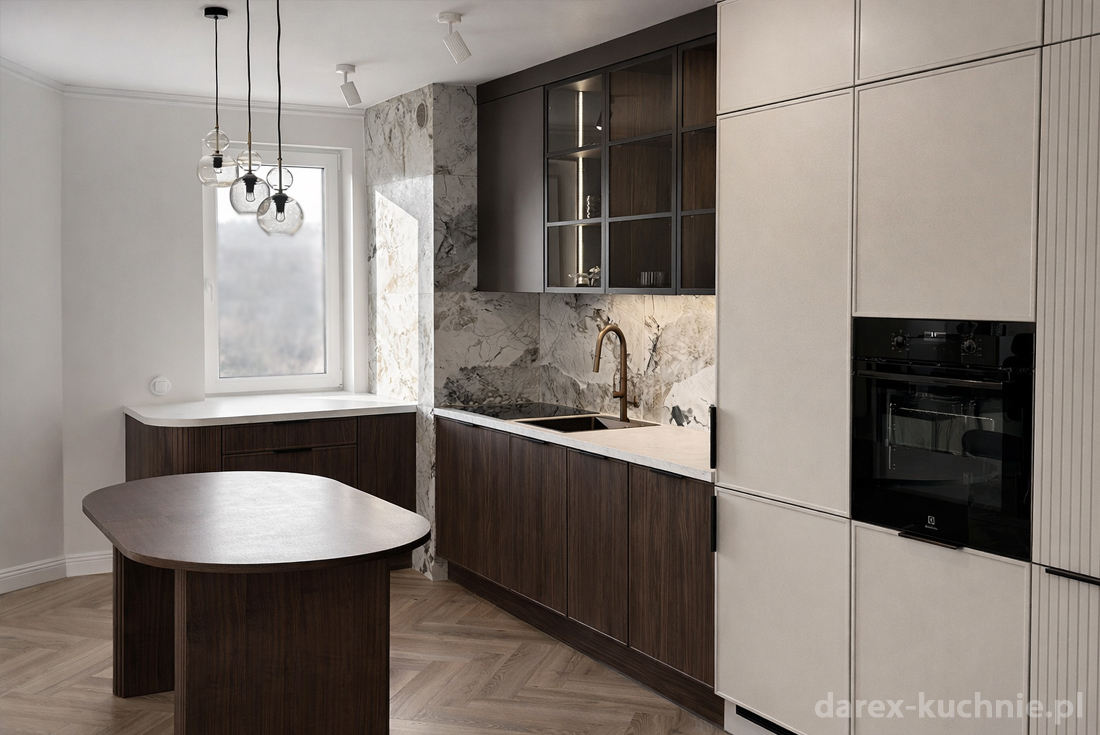 Zabudowa została zaprojektowana w sposób umożliwiający maksymalne wykorzystanie przestrzeni, przy jednoczesnym zachowaniu lekkości wizualnej. Układ kuchni został zaplanowany w sposób klarowny i ergonomiczny. Strefa robocza z centralnie umieszczonym zlewem została wyraźnie zaakcentowana pionowym pasem kamienia, który prowadzi wzrok od blatu aż do górnej linii zabudowy. Ten zabieg porządkuje kompozycję ściany i nadaje wnętrzu architektoniczną spójność. Półwysep z zaokrąglonym narożnikiem domyka układ, tworząc dodatkową powierzchnię roboczą.