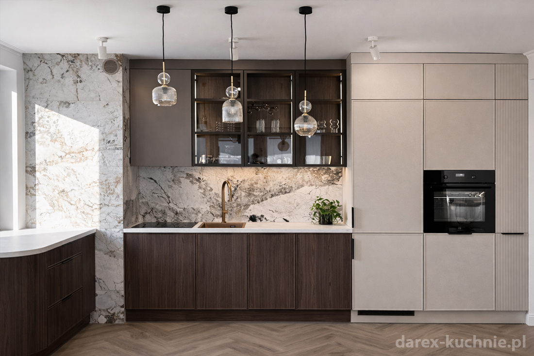 Zabudowa została wyposażona w sprzęt AGD zintegrowany z meblami, co pozwala zachować jednolitą, uporządkowaną formę. Detale, takie jak precyzyjne podziały frontów, spójna kolorystyka uchwytów oraz starannie dobrane proporcje, podkreślają jakość wykonania i dbałość o szczegóły.