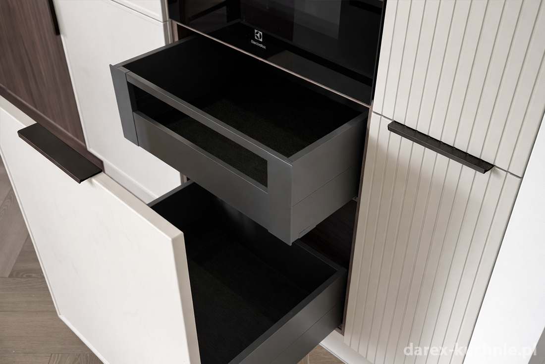Pod zabudowanym piekarnikiem zastosowano system szuflad z wewnętrzną, ukrytą szufladą. To rozwiązanie pozwala w pełni wykorzystać przestrzeń w słupku, zachowując jednocześnie jednolitą linię frontów z zewnątrz. Górna szuflada wewnętrzna, otwierana po wysunięciu frontu, idealnie sprawdza się do przechowywania drobnych akcesoriów kuchennych – rękawic, ściereczek, form do pieczenia czy przyborów do grillowania. Dolna, głębsza szuflada zapewnia miejsce na większe naczynia, blachy oraz garnki.